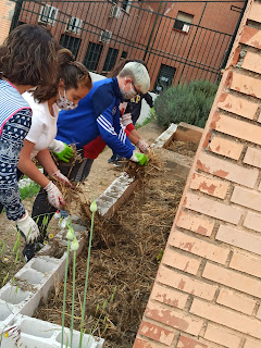 La clase de sexto B ha visitado el huerto de nuestro centro y han realizado diversas actividades: han rellenado un nuevo bancal con un acolchado de paja y después han añadido sustrato, también han creado una nueva zona de siembra en un contenedor de SADECO reciclado y, por último, han sembrado distintas plantas aromáticas como la lavanda, la albahaca y la hierbabuena: